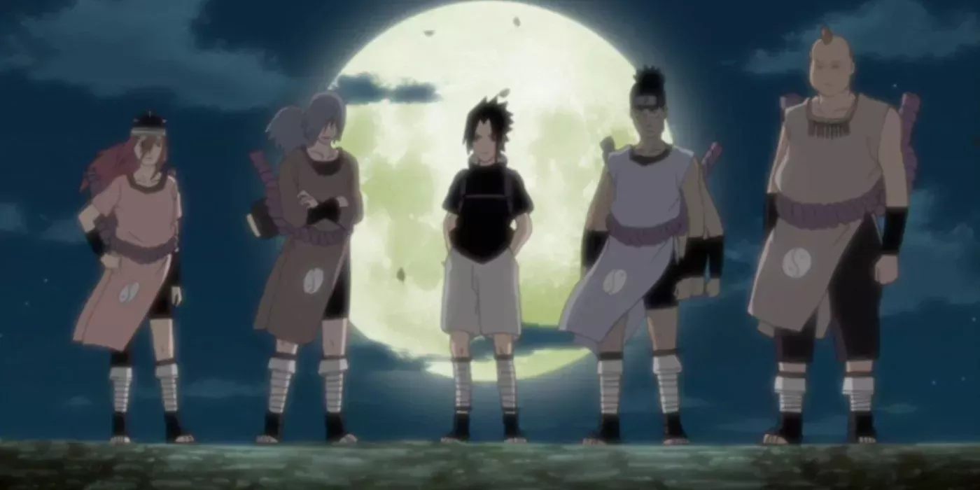 Los Cuatro del Sonido se infiltraron en la Aldea de la Hoja para llevar a Sasuke ante Orochimaru. Al principio se negó, pero entonces vio lo fuertes que les hacía la Marca de la Maldición de Orochimaru. Sasuke quería un poder similar para poder matar a su hermano mayor, así que decidió abandonar la aldea con ellos.