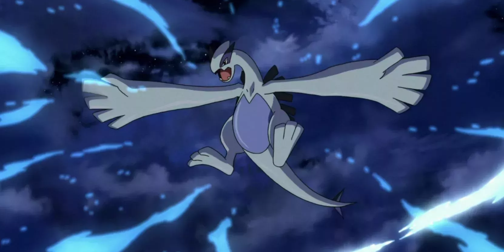 Lugia es invocado cuando Moltres, Zapdos y Articuno luchan entre sí en Pokémon la película 2000. El legendario "guardián del mar" intenta impedir que los demás legendarios luchen entre sí y mantener el equilibrio. Sin embargo, en su intento de sofocar los combates y proteger al mundo de la inminente perdición, Lugia resulta gravemente herido. Incapaz de seguir luchando, Lugia se estrella en el mar y luego es atrapado bajo el hielo por el Pokémon pájaro legendario. Cuando toda esperanza parece perdida para Ash y sus amigos, Lugia es revivido por la canción legendaria de Melody tocada en su flauta.