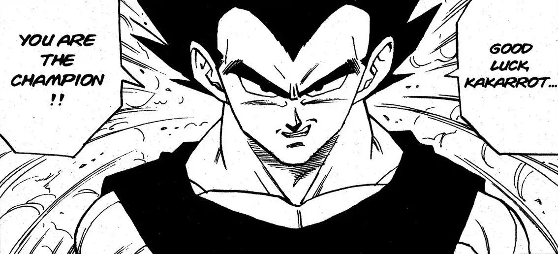 El crecimiento del personaje de Vegeta continúa en la Saga Majin Buu, en la que poco a poco desarrolla un fuerte vÃnculo con Goku. Su frase "Buena suerte, Kakarot... Tú eres el campeón" es una escena crucial para él que marca el final de su empeño por superar a Goku.