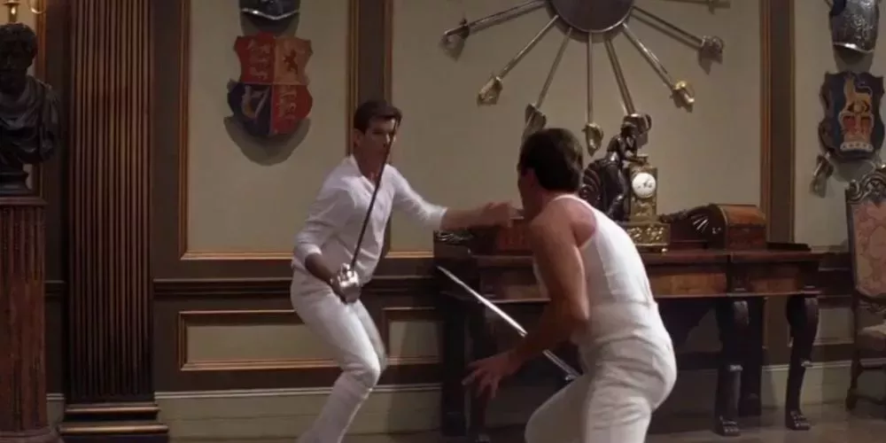 Enfrentándose inicialmente al villano Gustav Graves en un simple combate de esgrima, los dos comienzan a batirse en duelo con afilados estoques en lugar de con florete de esgrima, antes de cambiarlos por katanas y espadas largas. El combate está bien coreografiado y rodado. Es un emocionante duelo de espadas en la franquicia Bond, centrada en las armas y los puños.