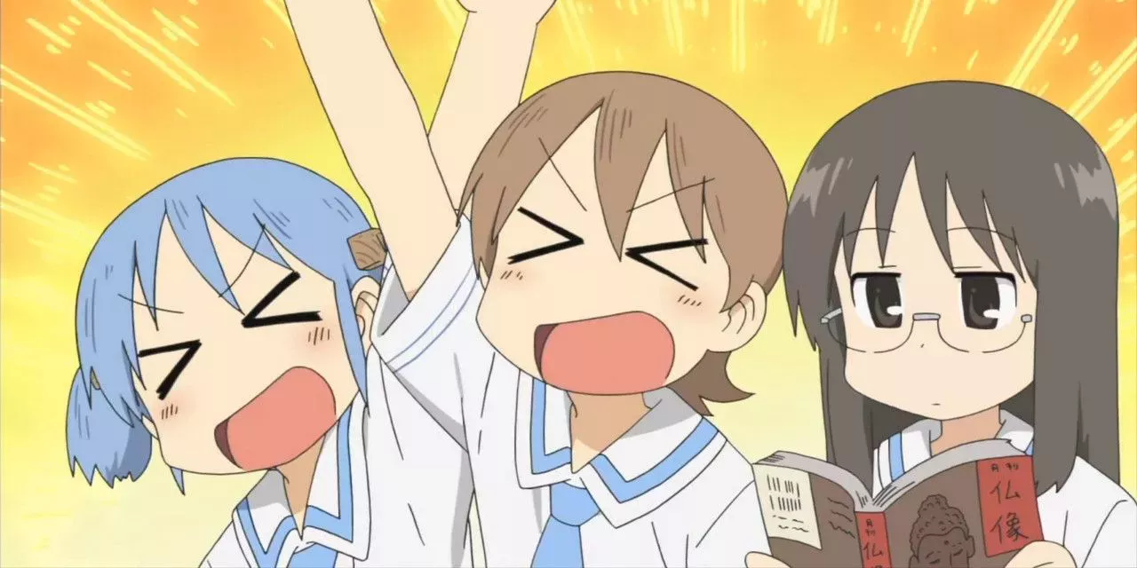 Nichijou es más o menos similar a Azumanga Daioh! siendo una serie de comedia centrada en las alocadas travesuras de un puñado de caprichosos personajes principales. Esta serie es aún más excéntrica, ya que está protagonizada por una chica robot de cuerda, un gato parlante y un joven profesor obsesionado con los tiburones y los aperitivos.