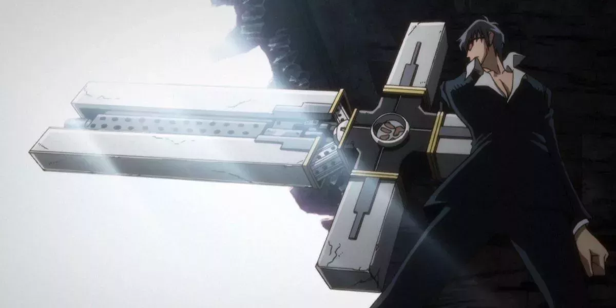 En Trigun , Wolfwood recibe el Cross Punisher del culto el Ojo de Miguel, lo que significa que es reconocido como el más fuerte de la orden. Por mucho prestigio que tenga, eso no cambia la carga que supone el arma.