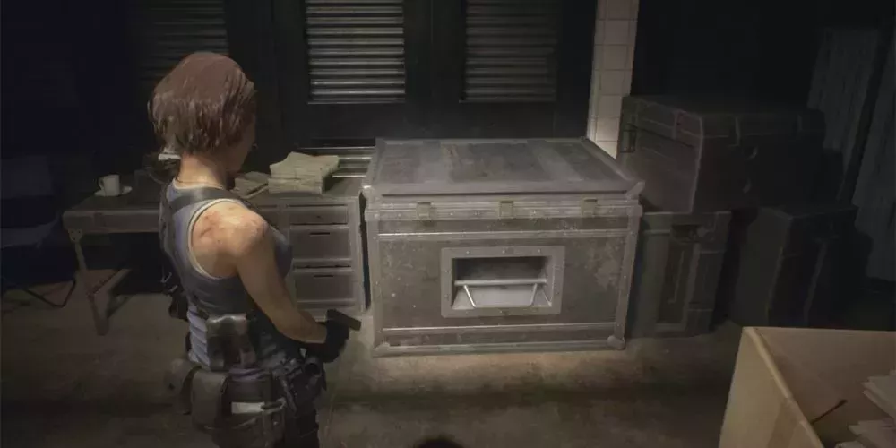 La caja de objetos es un elemento icónico en Resident Evil. En realidad, se trata de una red de cajas interconectadas a lo largo del juego que pueden compartir los objetos almacenados entre ellas. Esto recompensa a los jugadores por una cuidadosa gestión del inventario, un elemento esencial del juego, permitiéndoles mantener objetos fuera de su inventario sin necesidad de descartarlos.