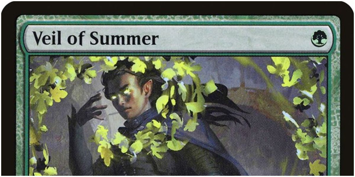 El Velo del Verano es bastante dañino para los mazos azules, negros y azul/negro, asà que casi tiene sentido que esté prohibido. Esta poderosa cartade la colección Trono de Eldenaes un instantáneo verde que cuesta un maná verde y permite al jugador robar una carta si el jugador contrario juega una carta azul o negra, hace que todos los hechizos del jugador no puedan ser contrarrestados y le da al jugador y a sus permanentes resistencia a los hechizos azules y negros.