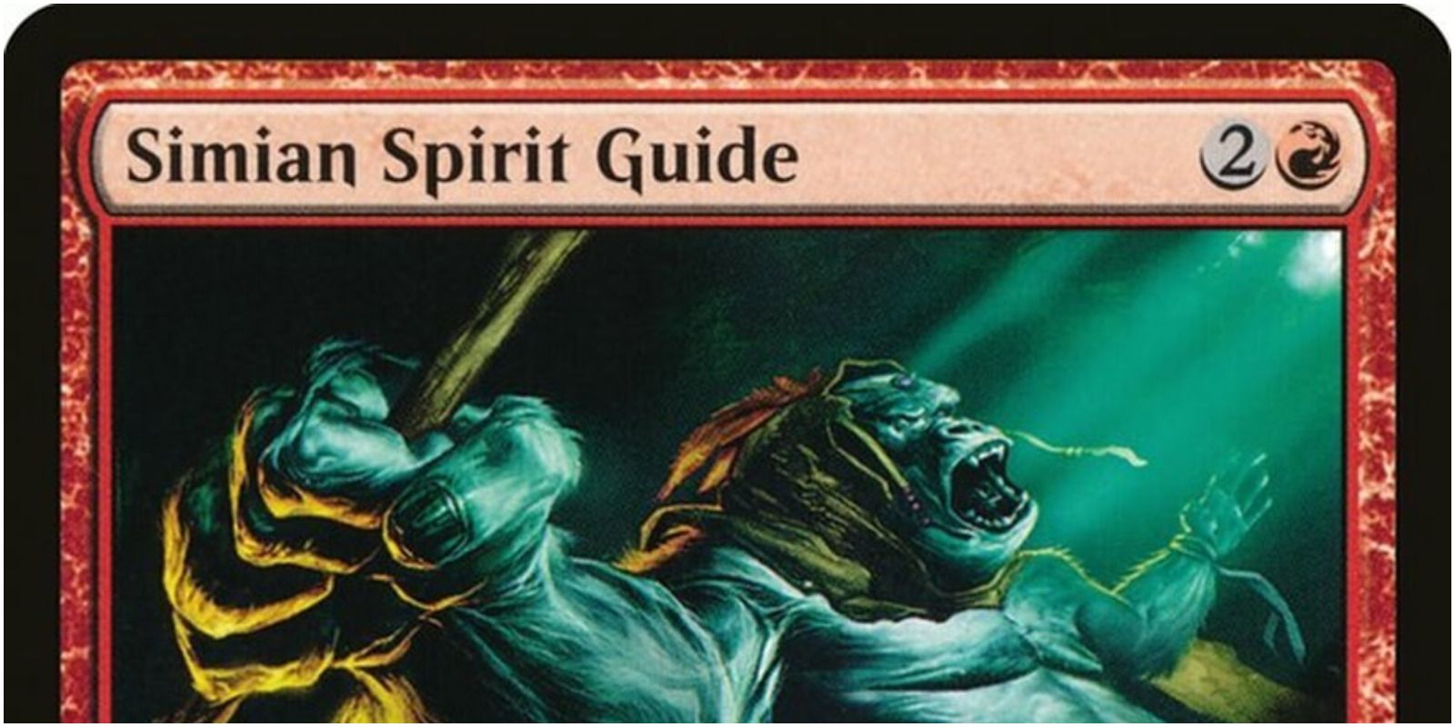 El EspĂritu GuĂa Simio es un EspĂritu Simio rojo 2/2 por un rojo y dos incoloros. Puede ser exiliado de la mano del jugador y le da un maná rojo. Eso es todo. Apenas hay buenos combos para Ă©l. Es un bloqueador o una fuente de maná para el juego temprano, pero hay muchas cartas que hacen ambas cosas y no están prohibidas.