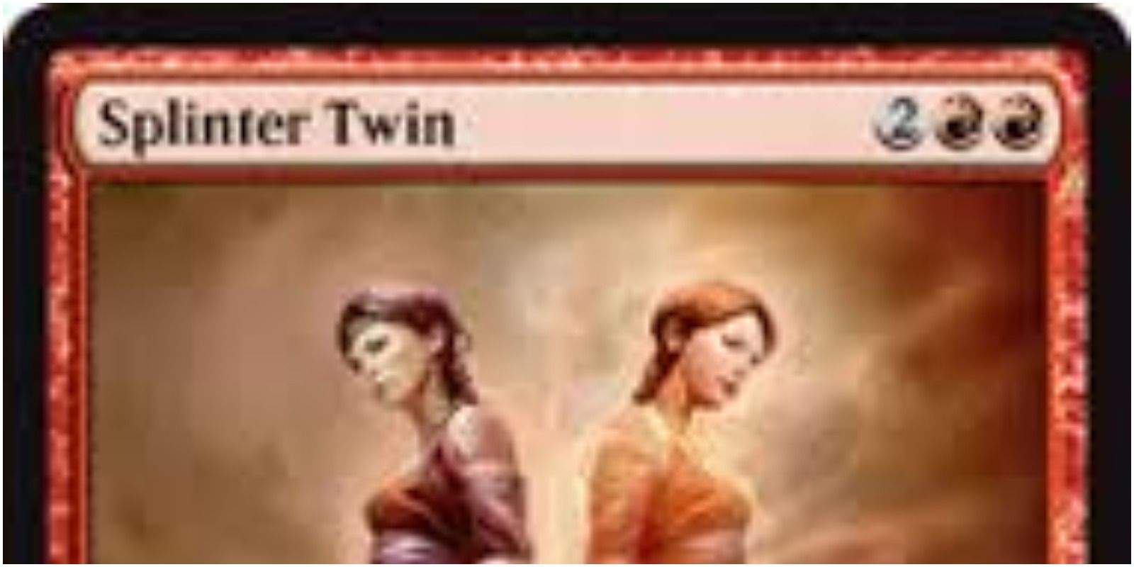 Splinter Twin es extraña porque parece una carta azul, pero es roja. Un aura de encantamiento da a la criatura encantada la capacidad de girar y crear un duplicado de ella con prisa y se exilia al final del turno por dos rojos y dos incoloros. Sinceramente, es raro que esté prohibida.