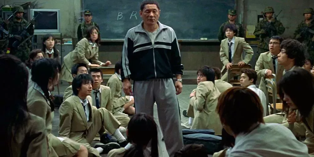 En Battle Royale , el fascista y conservador gobierno japonés respondió a los crecientes índices de criminalidad y delincuencia juvenil del país implantando El Programa. Cada año, una clase de cualquier colegio era elegida por sorteo para participar en el brutal juego a muerte Battle Royale, en el que solo puede sobrevivir un estudiante.