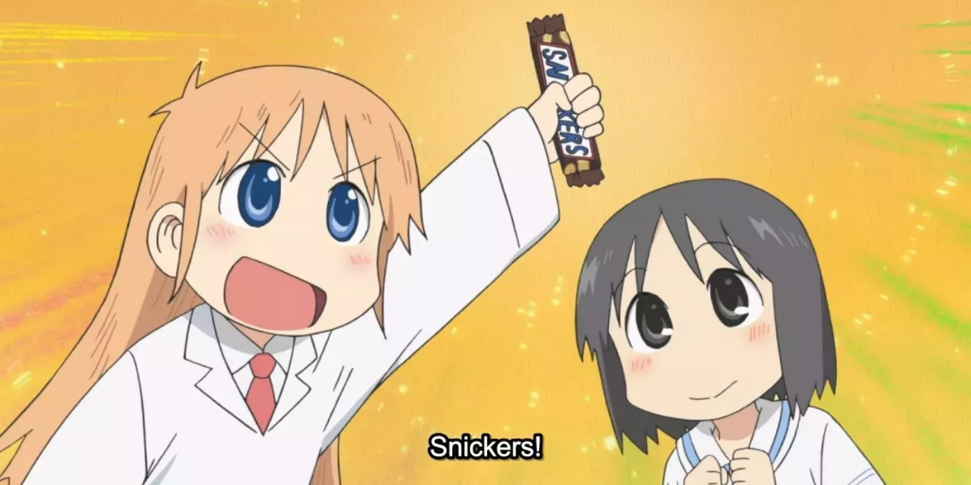 Tal vez no se trate de una colocación de producto directa, porque no se sabe si SNICKERS o Mars, Inc. tuvieron algo que ver con las payasadas del reparto de Nichijou. En una serie de comedia de humor en la que todo vale, la repentina aparición de un bar de SNICKERS puede haber sido un mero capricho, ¿no? Sólo podemos esperar.
