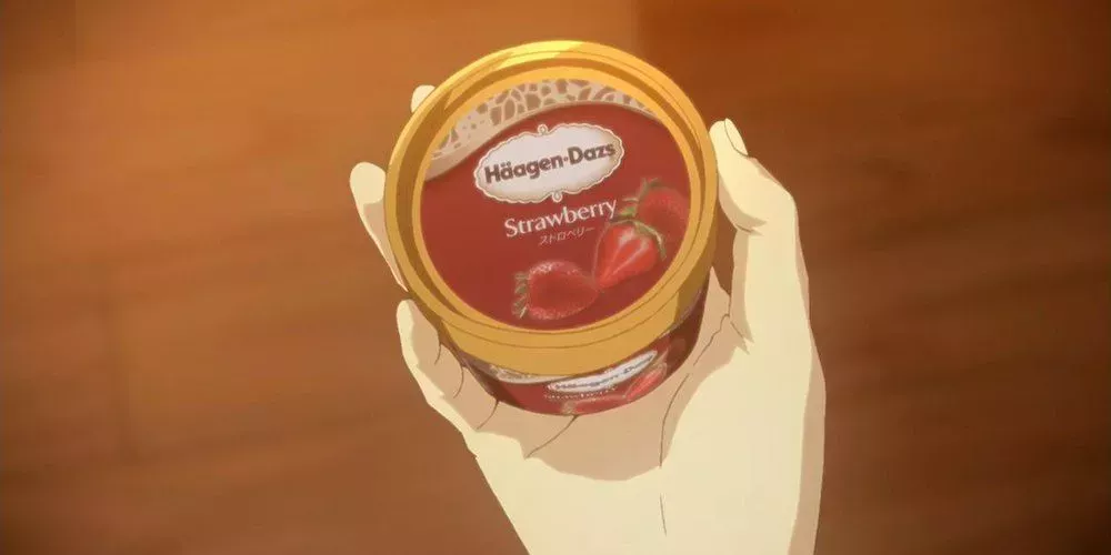 Así es. Más de una película de Garden of Sinners incorpora helado de fresa de Haagen-Dazs. Al parecer, el hecho de que un personaje sólo coma Haagen-Dazs también forma parte del material original, pero si eso no es pedir descaradamente un enlace, ¿qué es?