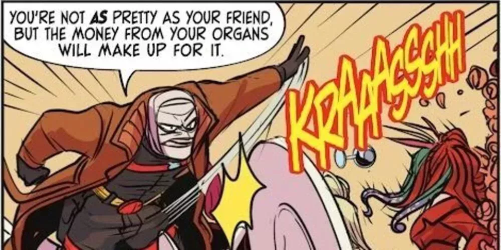 Hush es un villano muy nervioso y muy serio. Como tal, es exactamente el tipo de personaje del que Harley Quinn se burla tanto. Su trama más famosa fue reconstruir quirúrgicamente su propia cara para hacerla idéntica a la de Bruce Wayne. La comida. ¡Bang! Kill. Tour dio a los lectores una muestra de cómo podría ocurrir eso en el universo de la serie.