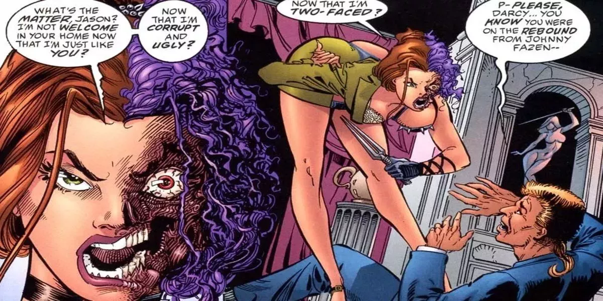 Kyle tiene una criada -con el traje de criada francesa más estereotipado que se pueda imaginar- y lucha contra Darcy Dent, el Dos Caras de este universo. Darcy era una supermodelo cuya carrera fue saboteada por una crema facial ácida. Puede que se haya escrito en los años 90, pero este Elseworlds va demasiado lejos con sus objetivaciones.