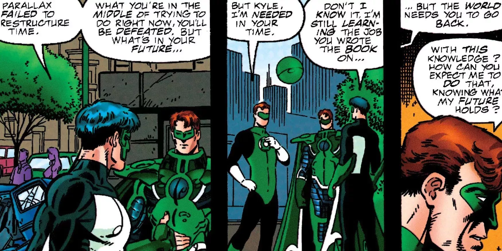Mientras está en el espacio profundo y desconocido, Kyle descubre el cuerpo de Hal Jordan. Kyle se entera de que Parallax, la Entidad del Miedo, se aferró al miedo de Hal y lo volvió loco. Kyle regresa a la Tierra con este secreto y lucha contra un Sinestro resucitado. Afortunadamente, Hal también ha resucitado y acude en ayuda de Kyle.