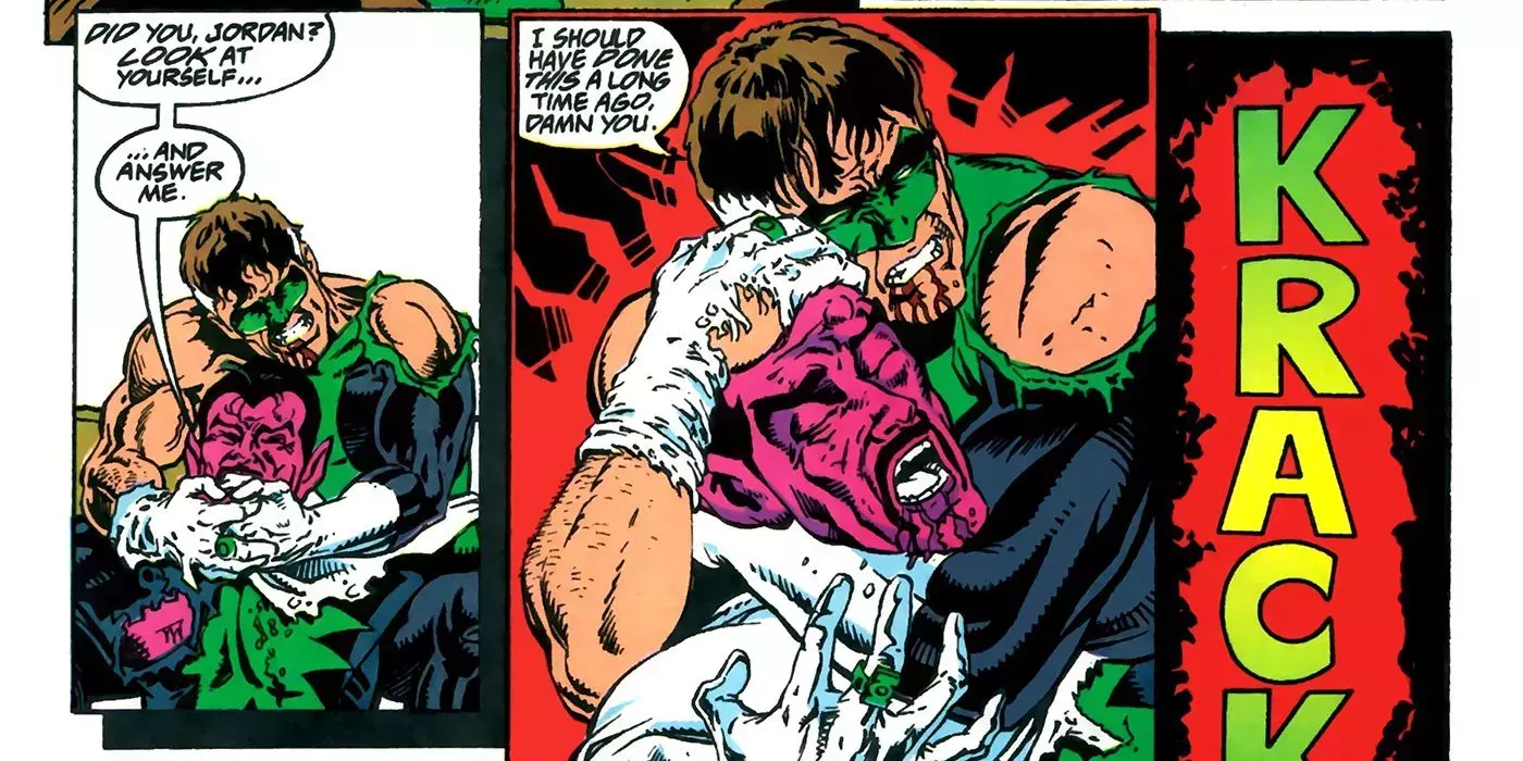La batalla representada en Green Lantern Vol.3 #50 es brutal y la forma en que termina es aún peor. Hal le rompe el cuello a Sinestro, sumiéndose en la oscuridad y dando el último paso para convertirse en Parallax. Sinestro se regodea en el miedo a la pérdida que ha consumido a Hal, sabiendo que su heroico adversario se ha convertido en un villano.