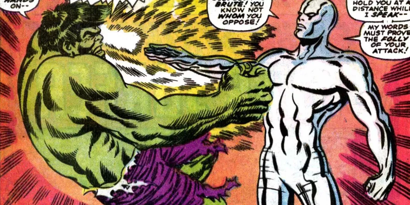 El cósmicamente poderoso Silver Surfer y el gamma-irradiado Hulk no tienen más que desencuentros en Tales to Astonish #92 y #93. Estos futuros compañeros de equipo tuvieron un primer encuentro tan horrible que debió parecer que estarían enfrentados para siempre. En 1971, Hulk, el Doctor Extraño, el Príncipe Namor el Submarino y Silver Surfer se unieron de forma improbable para formar Los Defensores.