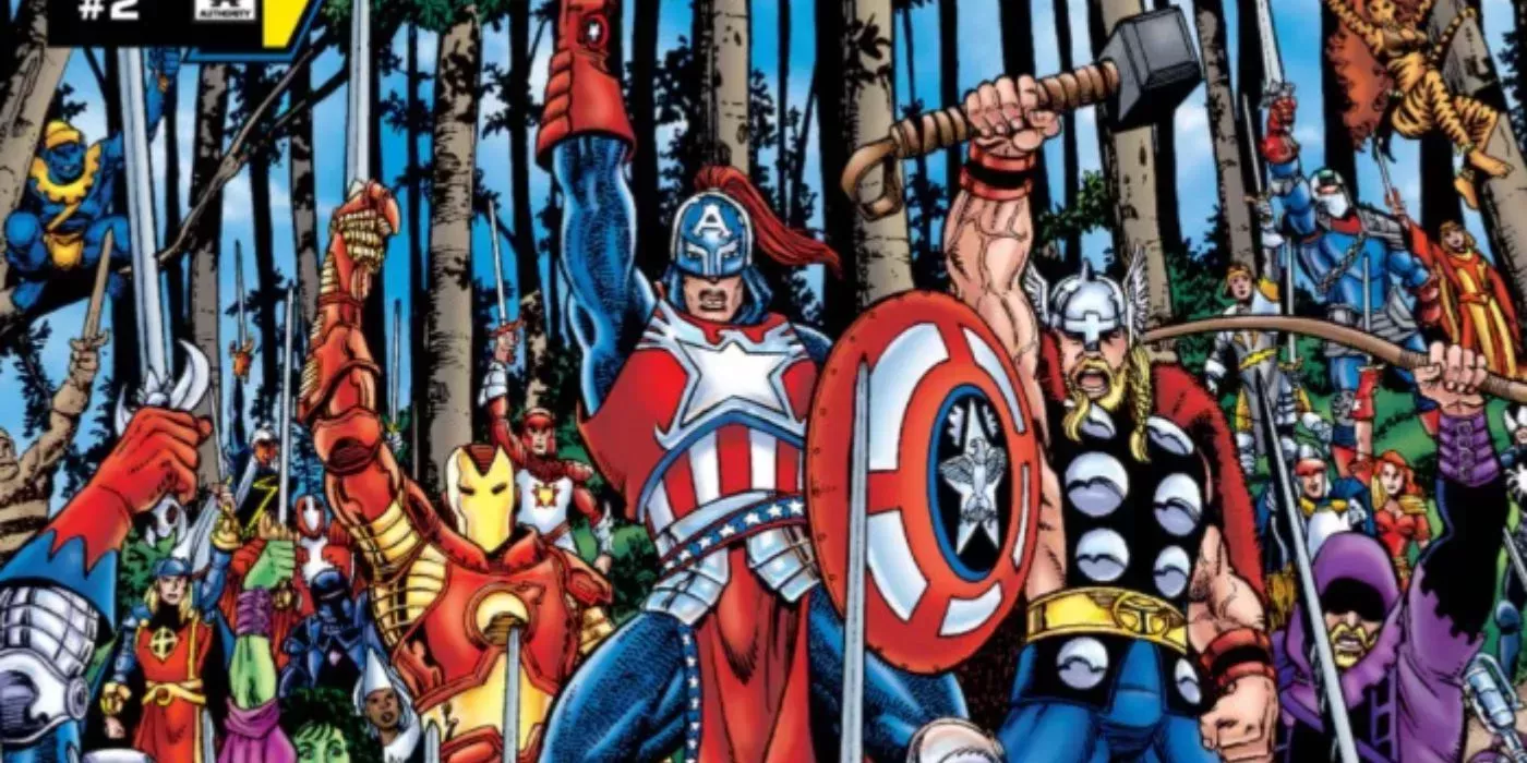 La nota inicial de la sinfonía de los Vengadores de Kurt Busiek y George Peréz fue gloriosa. En un mundo medieval alternativo, el Capitán América es el único Vengador que recuerda el mundo real. Pronto se les une Ojo de Halcón, los dos héroes liberan a sus compatriotas de su lavado de cerebro y llevan la batalla a Morgan Le Fay.