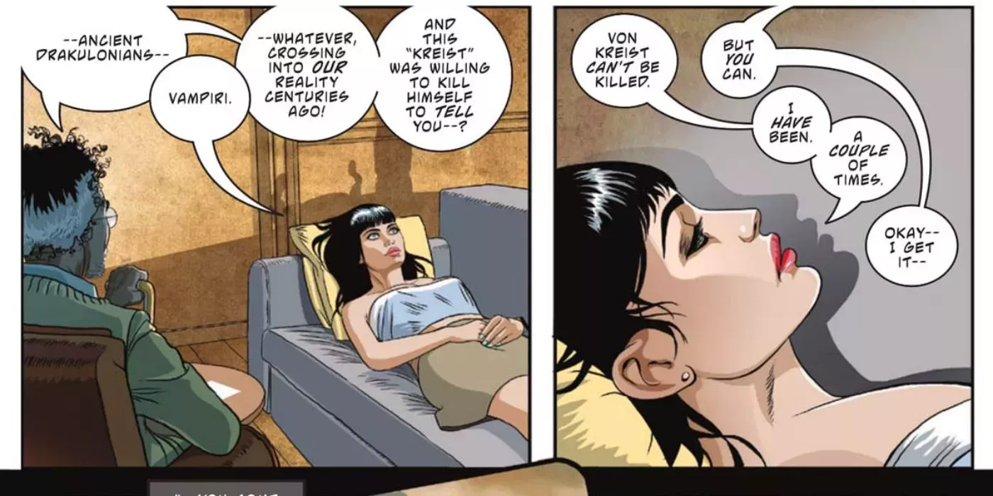 Utilizando la terapia como una forma de aceptar su pasado, Vampirella lo pone todo sobre la mesa. Es dura y fuerte, pero también vulnerable y, sobre todo, humana. El escenario de Ashthorne y su interminable batalla entre sus minorías sobrenaturales oprimidas contra la ciudad vecina de Sacred, ultrarreligiosa y de derechas, es un comentario sin tapujos sobre muchos de los problemas de hoy en día y hace que esta sea una de las versiones más profundas e importantes de Vampirella jamás escritas.