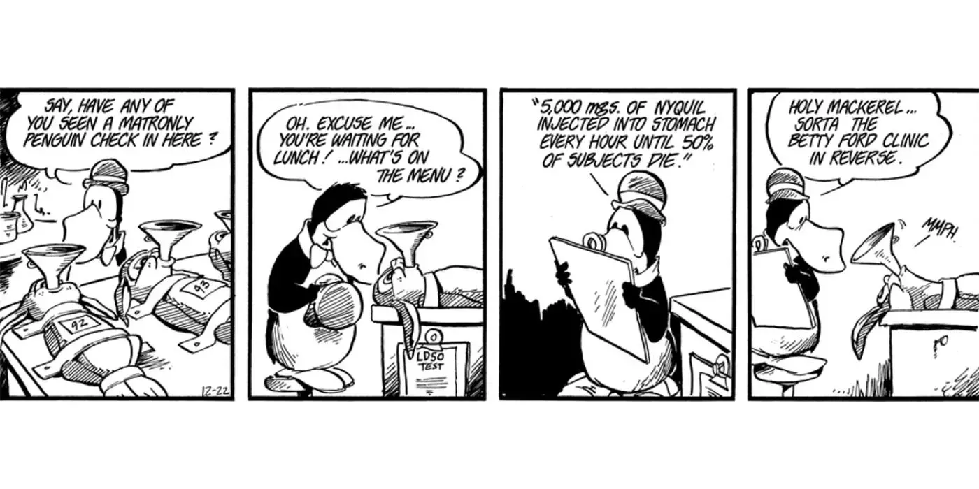 BloomCounty hacía reír a carcajadas a sus lectores. Sin embargo, las mejores tiras cómicas, como Bloom County y Calvin y Hobbes, también podían ser bastante oscuras. La serie de cómics Bloom County que Berkeley Breathed escribió sobre el tema de la experimentación con animales es una de sus obras más tristemente célebres.