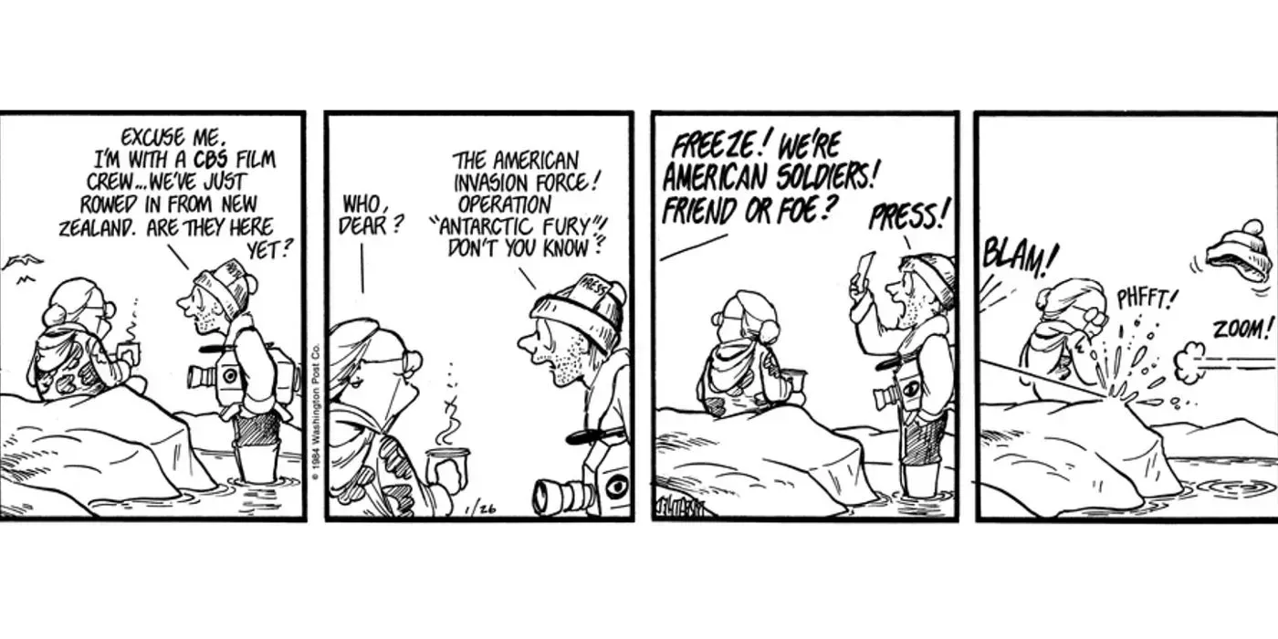 Como ilustra esta tira cómica del condado de Bloom, el peligro inherente a ser periodista no es nada nuevo. Incluso en la década de 1980, los expertos hacían chistes sobre miembros de la prensa que recibían disparos intencionados de combatientes. Algunas cuestiones sociales son claramente tan relevantes hoy como lo eran hace 40 años.