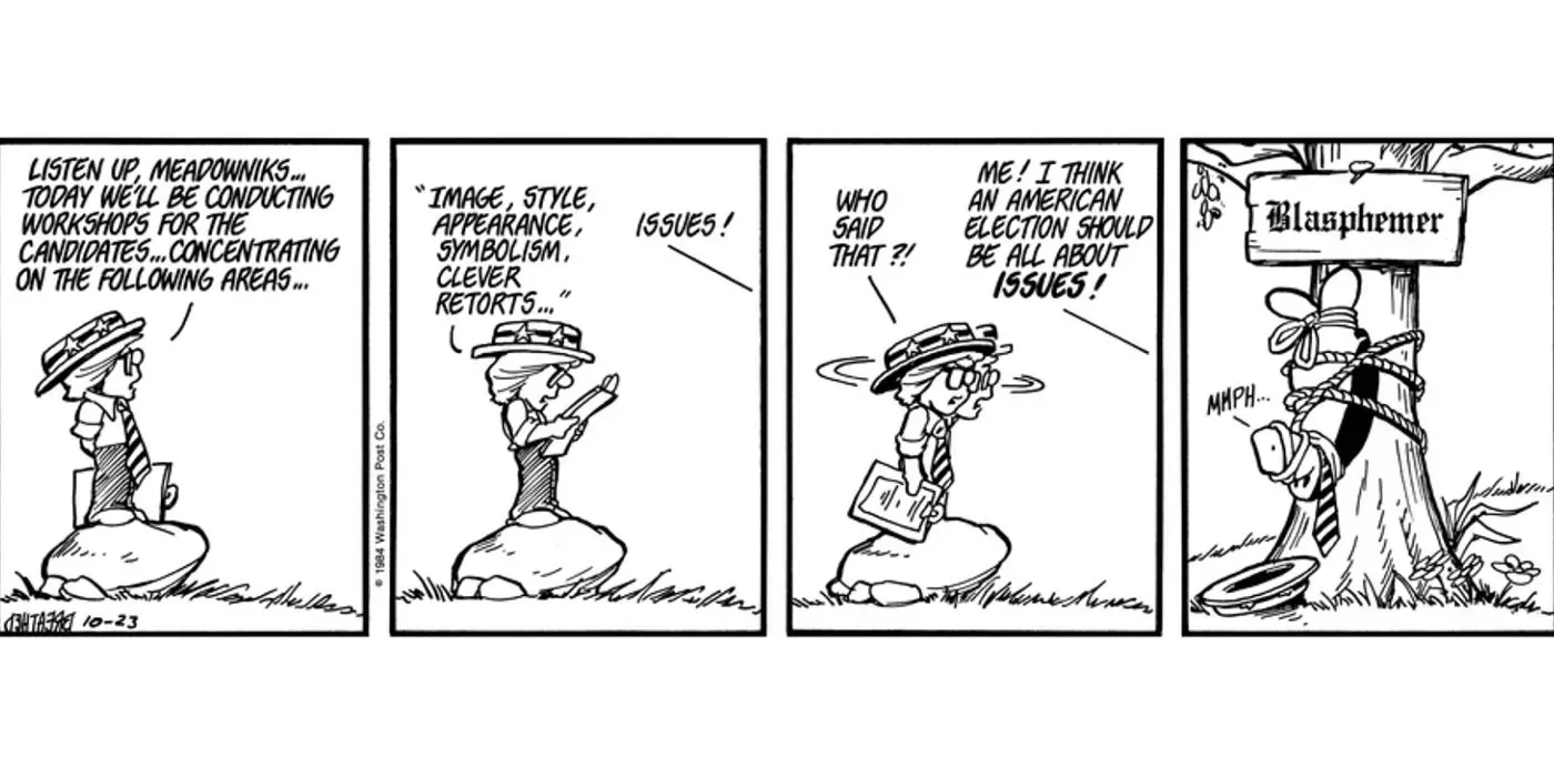 Muchos de los mejores cómics de Bloom County incluían comentarios políticos que se aplicaban no sólo a unas elecciones concretas, sino a la política en general. Aquí, Milo se centra por completo en las imágenes que proyectan los candidatos, y cuando Opus sugiere que los temas realmente importan, es tachado de blasfemo y amordazado. Por desgracia, este comentario sigue pareciendo totalmente relevante para las elecciones estadounidenses de hoy.