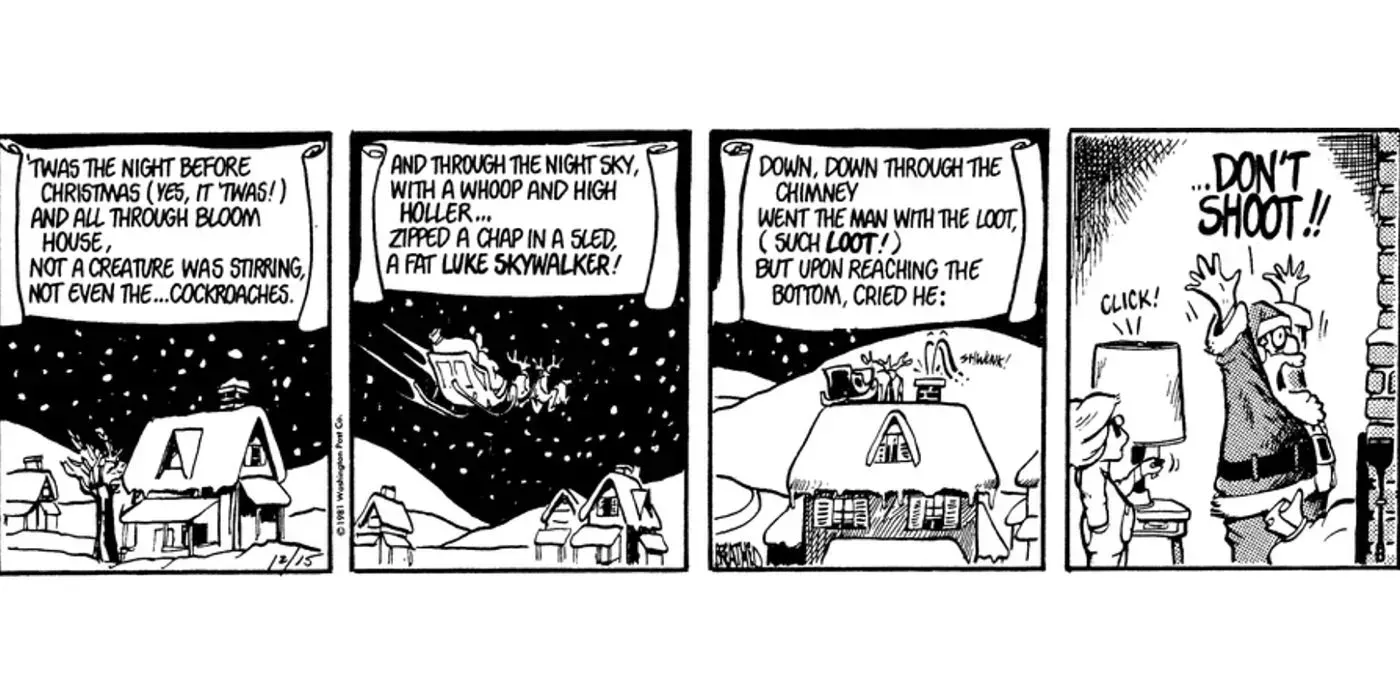 Al creador de BloomCounty, Berkeley Breathed, le encantaba incluir prosa en sus cómics, sobre todo si parodiaba otra obra famosa. Bloom County también publicaba todos los años historietas relacionadas con la Navidad, aunque normalmente con un toque satírico. Aquí, Breathed ha combinado estas dos prácticas para una parodia navideña con mensaje.
