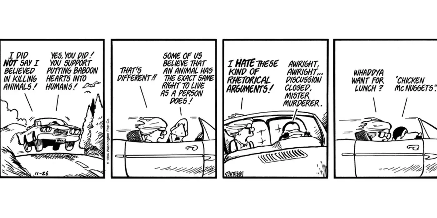 El creador de BloomCounty, Berkeley Breathed, era un gran defensor de los derechos de los animales, y a veces abordaba el tema en sus cómics, utilizando el elenco de personajes animales para expresar sus preocupaciones. A Breathed también le gustaba denunciar la hipocresía, y en este cómic de Bloom County pudo hacer ambas cosas. Los personajes de esta tira abordan un tema que sigue siendo de plena actualidad: la ética del consumo de carne.