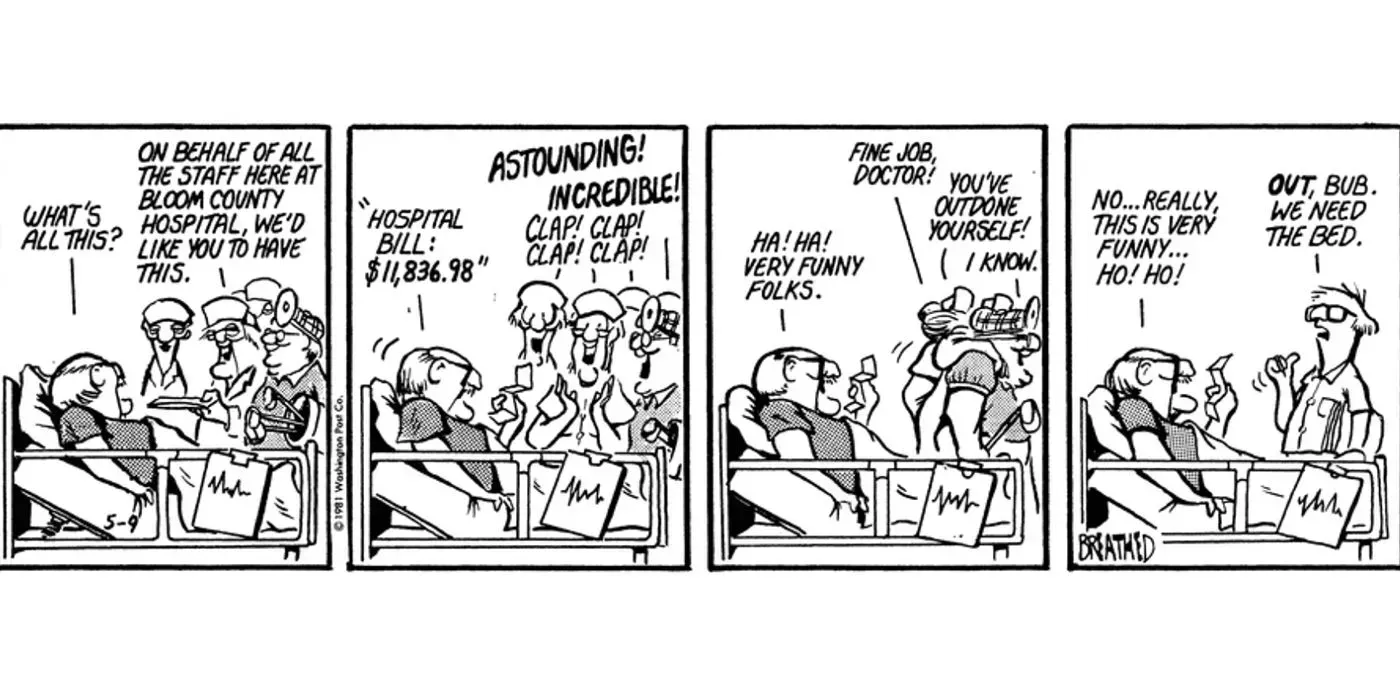 Algunas de las cuestiones políticas y sociales que se abordan en los cómics de Bloom County son específicas de la década de 1980, pero los problemas del sistema sanitario estadounidense no han hecho más que empeorar desde entonces. En este cómic clásico de Bloom County, el abuelo de Milo fue expulsado bruscamente del hospital y recibió una factura de miles de dólares.
