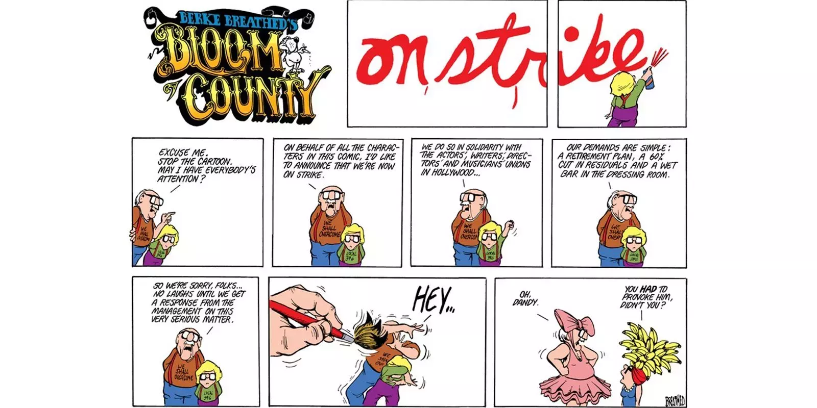 A principios de los 80, la mayoría de los sindicatos creativos se declararon en huelga. Bloom County abordó la huelga haciendo que sus personajes también intentaran ponerse en huelga. Dado que tanto el WGA como el SAG están en huelga hasta finales de 2023, este cómic de Bloom County es increíblemente relevante para la situación actual de Hollywood.