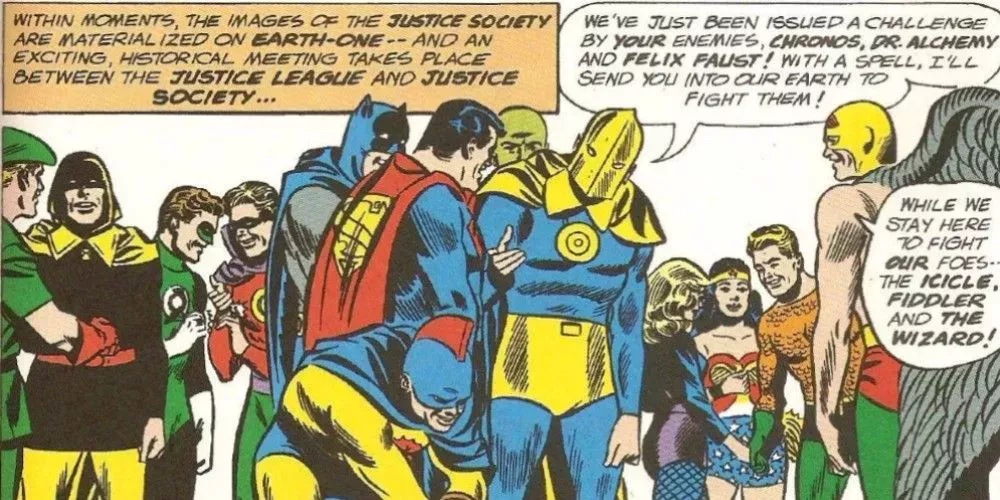 La Sociedad de la Justicia fue el superequipo original de DC. El número 123 de The Flash estableció que el equipo residía en Tierra-Dos, preparando el terreno para el siguiente cruce entre los dos mundos. Esto ocurrió en Justice League Of America (Vol. 1) #21, del escritor Gardner Fox y el artista Mike Sekowsky, cuando los dos equipos se unieron para luchar contra los villanos de ambas Tierras.