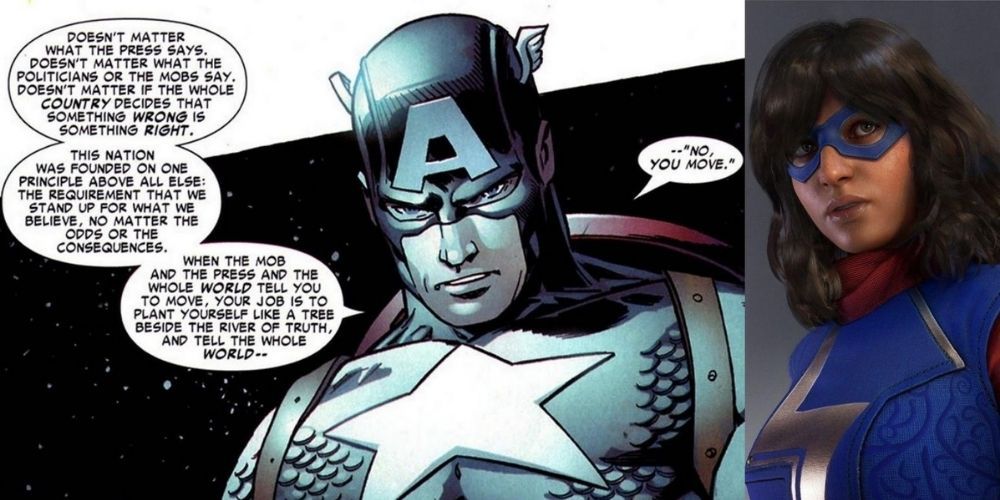 Ella regresa rápidamente y les da una línea icónica del Capitán América que también fue adoptada por Sharon Carter en el Capitán América: La Guerra Civil. Curiosamente, los matones ni siquiera reconocen la línea después de decirle a Kamala que ella misma no es una verdadera fanática.