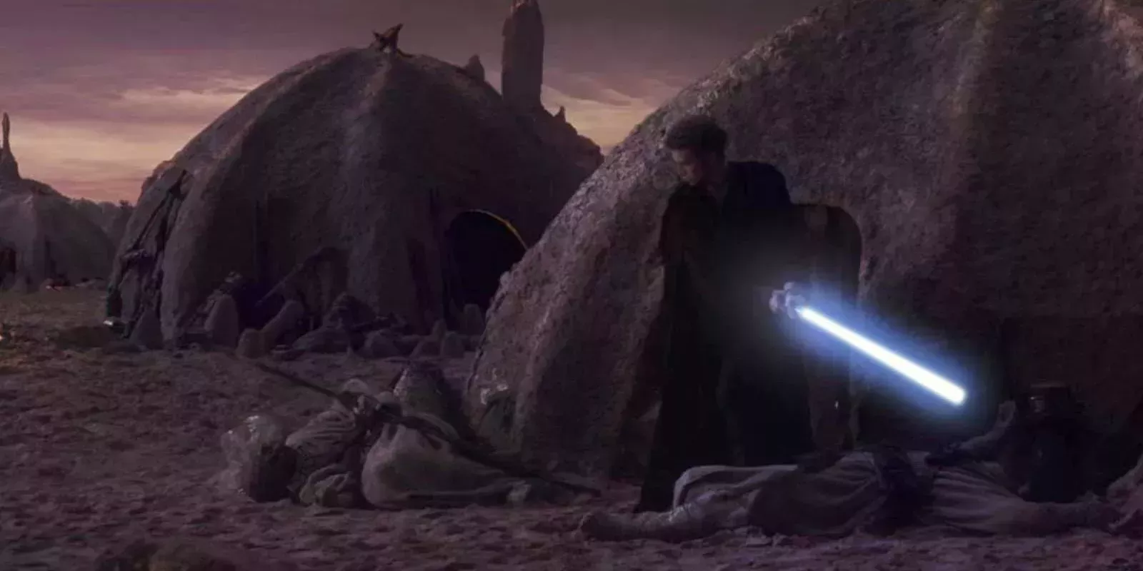 En El ataque de los clones, Anakin masacra a un pueblo de incursores Tusken en venganza. Esto incluye no combatientes desarmados y niños. Sin embargo, la película sólo se detiene en ese acto como uno de los pasos de Anakin hacia la oscuridad. Sigue esperando que el público simpatice y se identifique con Anakin después de que masacre a niños.