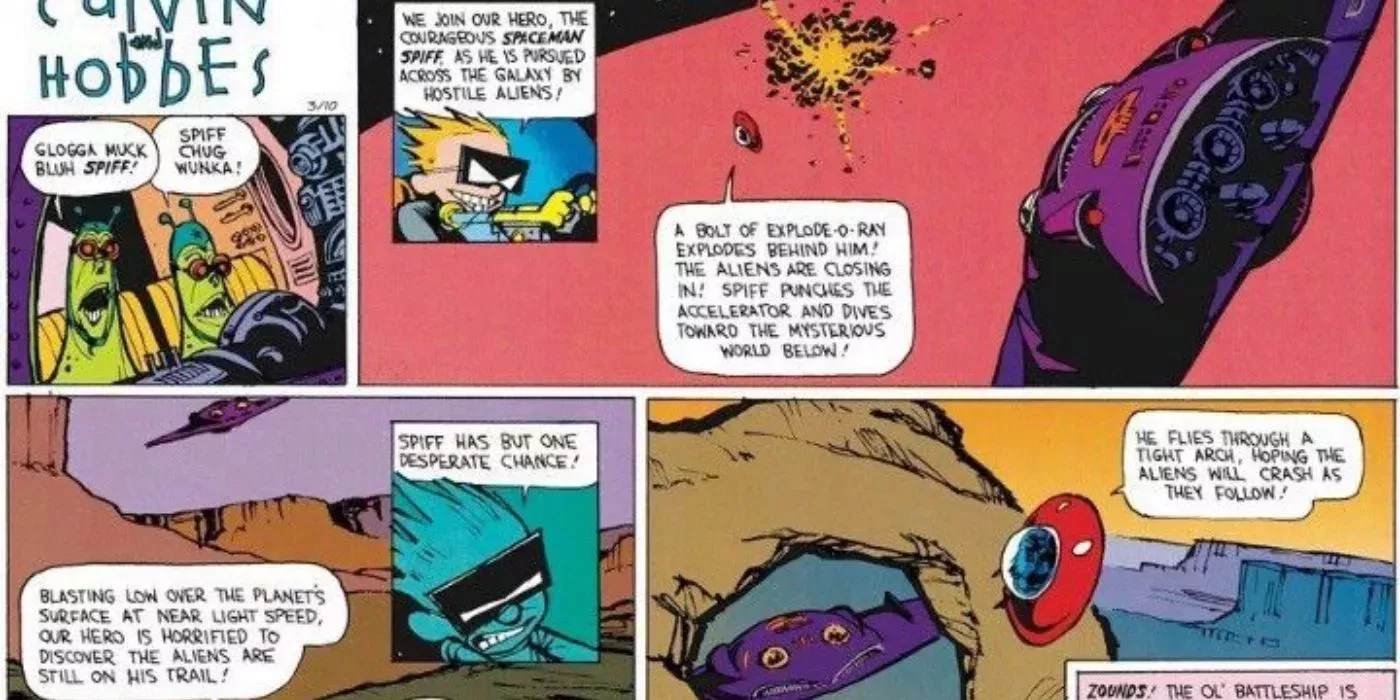 Cuando Calvin se adentró en el mundo de Spaceman Spiff o Tracer Bullet, Watterson cambió no sólo su estilo, sino sus paneles. Junto con el estilo artístico más orientado a la acción que adoptó en estas situaciones, Watterson empleó estilos innovadores que permitían crear monstruos gigantes o naves espaciales que salían volando de los paneles.