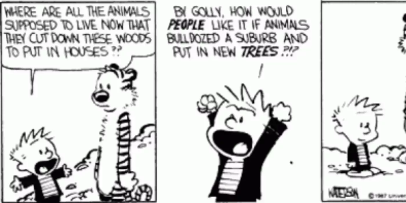 La ruptura de los límites deCalvin y Hobbes no se limitó a las florituras estilísticas. Watterson también utilizó a su precoz protagonista para explorar ideas que trascendían los límites de las tiras cómicas de los periódicos. Como niño demasiado inteligente y sin filtro, Calvin era la herramienta perfecta para que Watterson desmenuzara la sociedad.
