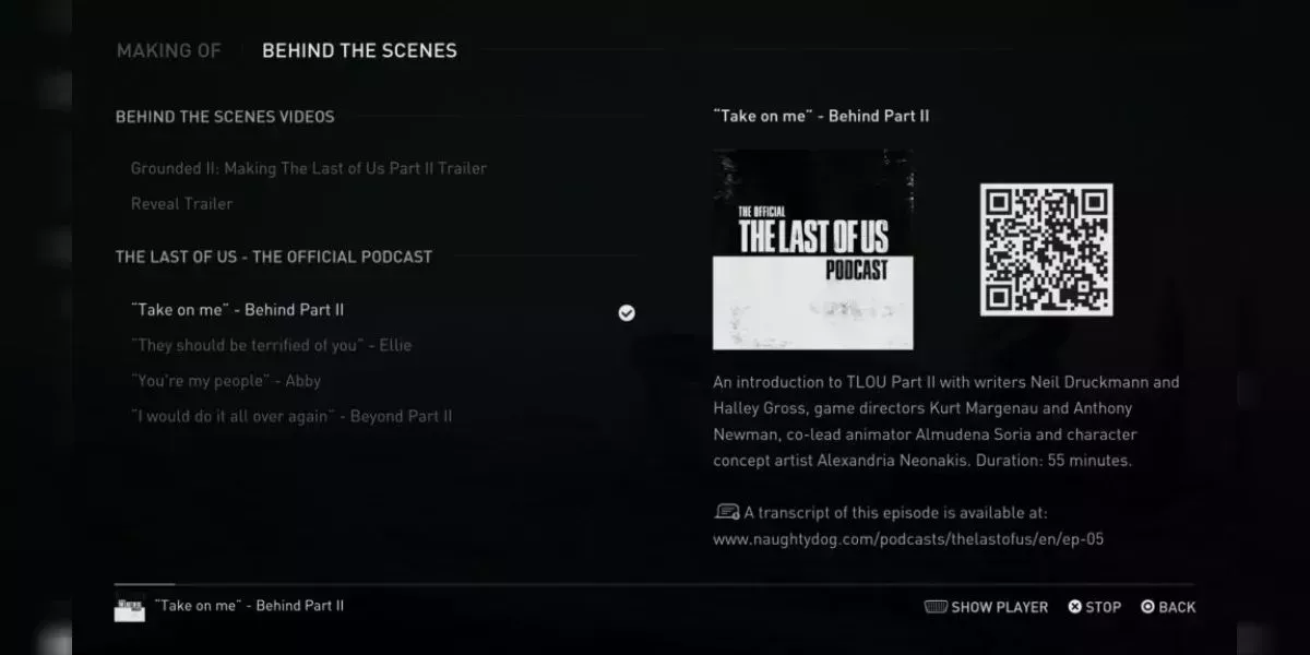 El menú "Making Of" no solo sirve para activar o desactivar los comentarios o para encontrar los niveles perdidos. También ofrece más información sobre The Last of Us entre bastidores. Los jugadores también pueden encontrar arte conceptual y la posibilidad de activar las descripciones de audio de las escenas. También hay cuatro episodios de The Last of Us - The Official Podcast, con casi cuatro horas de debate sobre el juego, Ellie y Abby. Druckmann está acompañado por la escritora Hally Gross, otras mentes detrás del juego y actores de doblaje como Troy Baker y Ashley Johnson.