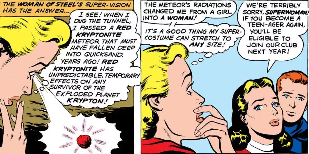 Para demostrar sus poderes, Supergirl cavó un túnel a través de la Tierra para aliviar el congestionado transporte aéreo del siglo XXX. Por desgracia, cavó demasiado cerca de un poco de kriptonita roja que la hizo envejecer hasta la edad adulta. Supergirl fue descalificada y enviada a casa para esperar a que el efecto de la kriptonita roja desapareciera.