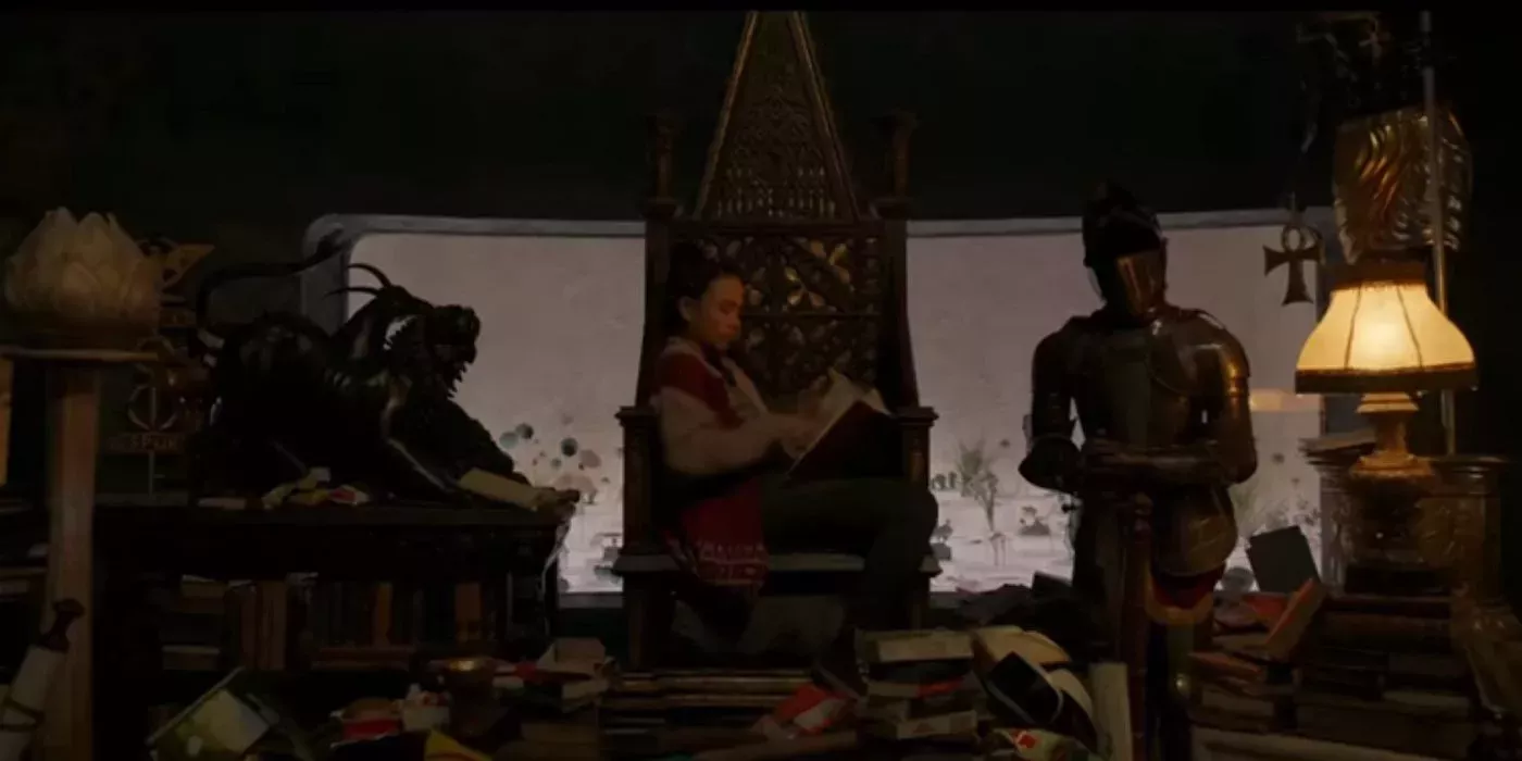 La velocista residente del grupo aparece sentada entre muchas reliquias antiguas y potencialmente importantes mientras descansa en una silla en el centro de la habitación. Hay montones de huevos de pascua históricos, desde armaduras medievales y antiguas reliquias egipcias hasta artefactos romanos y baratijas de Oriente y todo lo demás, lo que sugiere que los fans pueden echar un vistazo a algunas aventuras pasadas de los Eternos.