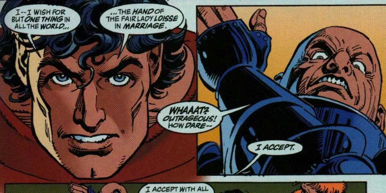 Es lógico que Superman: Kal acabe con todas las pretensiones y presente a Superman como el caballero fantástico que realmente es. Armado con una espada y un arco, corriendo para luchar por la mujer que ama, Superman se convierte en un arquetipo atemporal de la alta fantasía. Aunque Lex Luthor lleva una armadura casi mítica y una espada forjada a partir del cohete espacial de Kal-El, Superman es el caballero más alto y fuerte de la historia de Elseworlds.