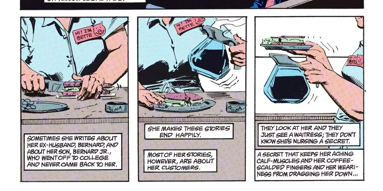 Muchos consideran que Sandmanes la cumbre del cómic. La prosa de Neil Gaiman es una parte clave de esto. Un aspecto en el que el cómic siempre será mejor que la televisión o el cine es que puede meter al lector en la cabeza de los personajes. Un buen guionista puede ofrecer al lector múltiples puntos de vista en un solo panel, dotando a cada uno de una voz individual.