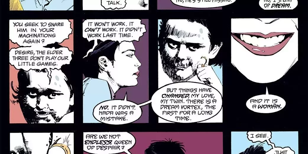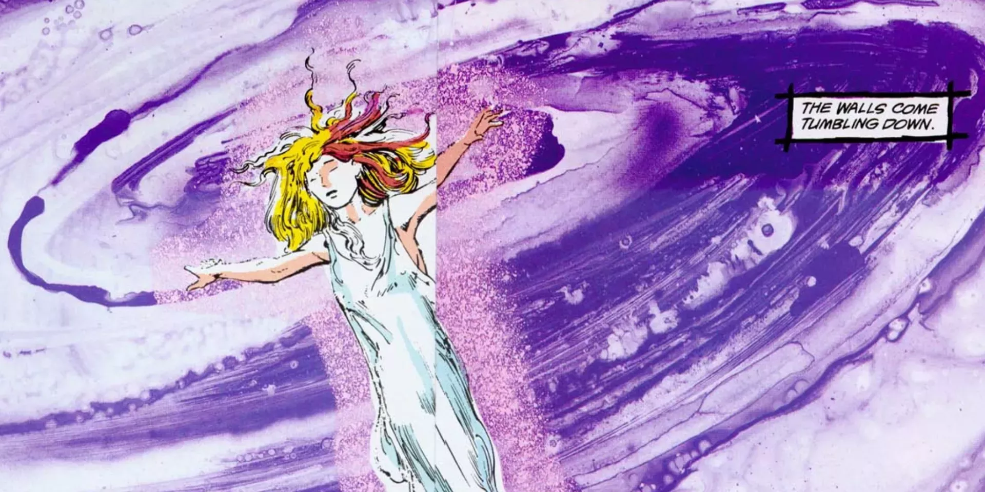 The Sandman #15 presenta el vórtice de una manera muy diferente. Los lápices de Mike Dringenberg, las tintas de Malcolm Jones III y los colores de Robbie Busch se combinan para crear una escena alucinógena que se quedará en los lectores para siempre. Es hermosa y aterradora de una manera que la escena de la serie no lo es.