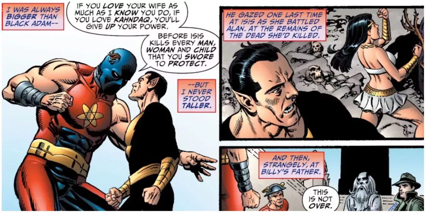 Al regresar a Khandaq junto a su esposa, Isis, a la que Black Adam le dio poderes hace unos números, Black Adam se sorprende cuando Isis desata de repente su poder sobre la gente de Khandaq. Al darse cuenta de que el poder la ha corrompido, Atom Smasher suplica a Black Adam que renuncie a sus poderes, lo que también privaría a Isis de sus poderes. Tras una larga súplica, Black Adam accede y renuncia a sus poderes, lo que da lugar a uno de los momentos más heroicos de Black Adam en la historia de DC.