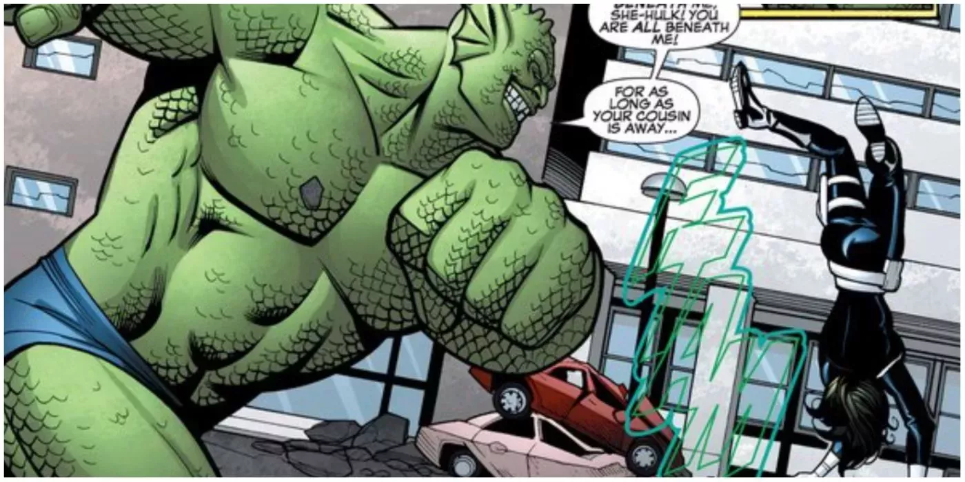 En el cómic, Abominación decide que puede hacer lo que le plazca ya que nadie es lo suficientemente poderoso como para detenerlo desde que Hulk está desaparecido en combate. She-Hulk no tarda en demostrar que es el luchador más capaz de los dos tras desafiar a Abominación durante un encuentro entre villanos. Tras una breve batalla, She-Hulk asesta un enorme puñetazo en la cara de Abominación y lo deja fuera de combate.