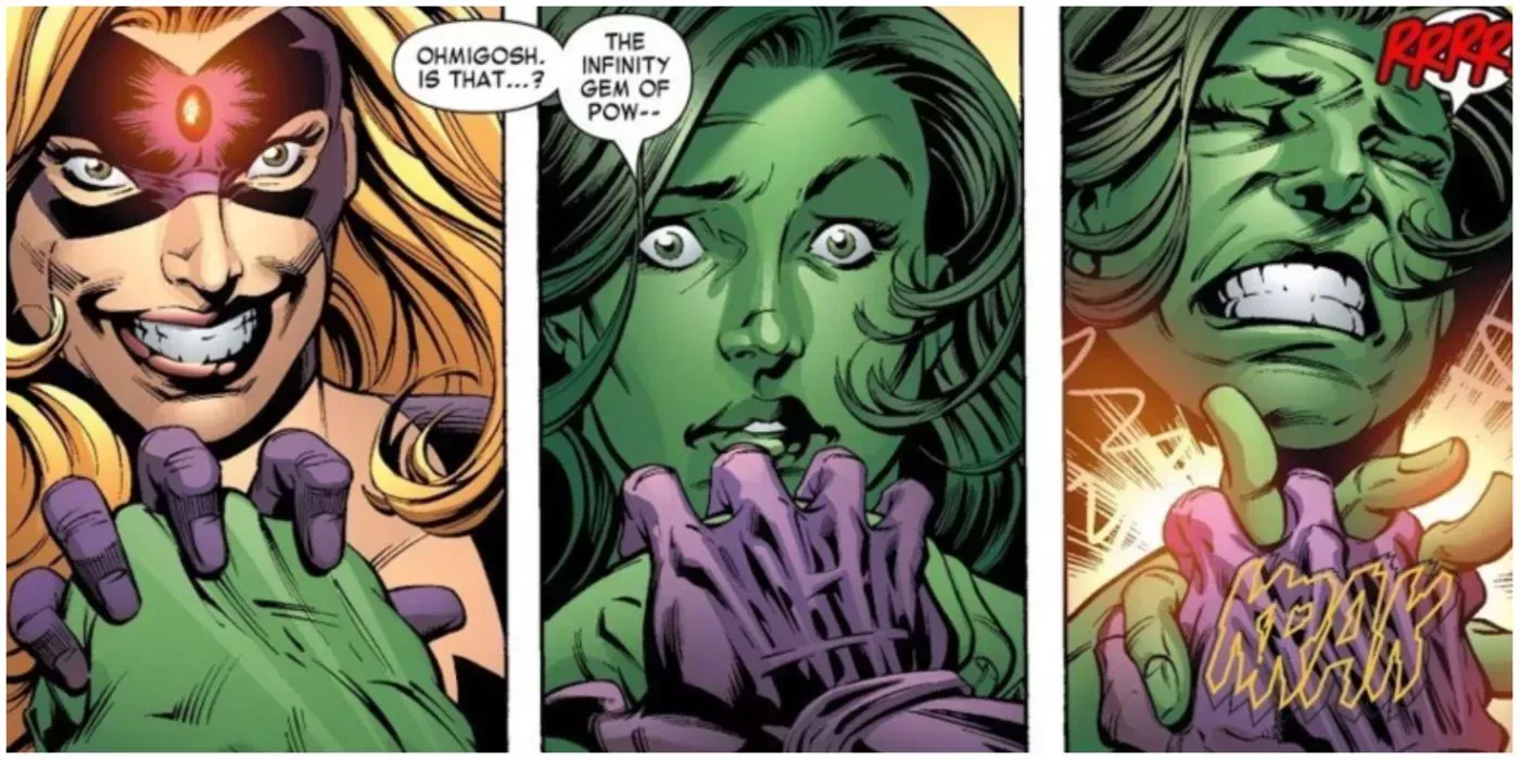 Más adelante en el número, a Titania se le ofreció la oportunidad de obtener la Gema del Poder: una de las legendarias Gemas del Infinito. Al escuchar una oferta de Tryco Slatterus, el antiguo Campeón del Universo, Titania aceptó la Gema del Poder con la condición de derrotar a She-Hulk, lo que también permitió a Slatterus vengarse por poder de su pérdida a manos de She-Hulk.
