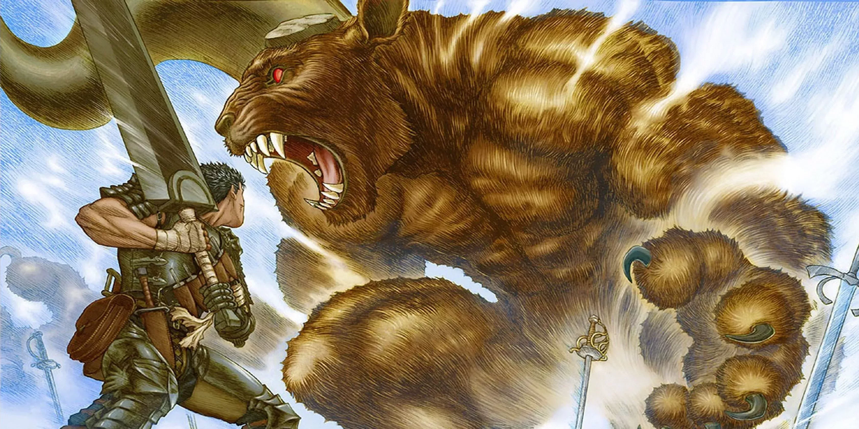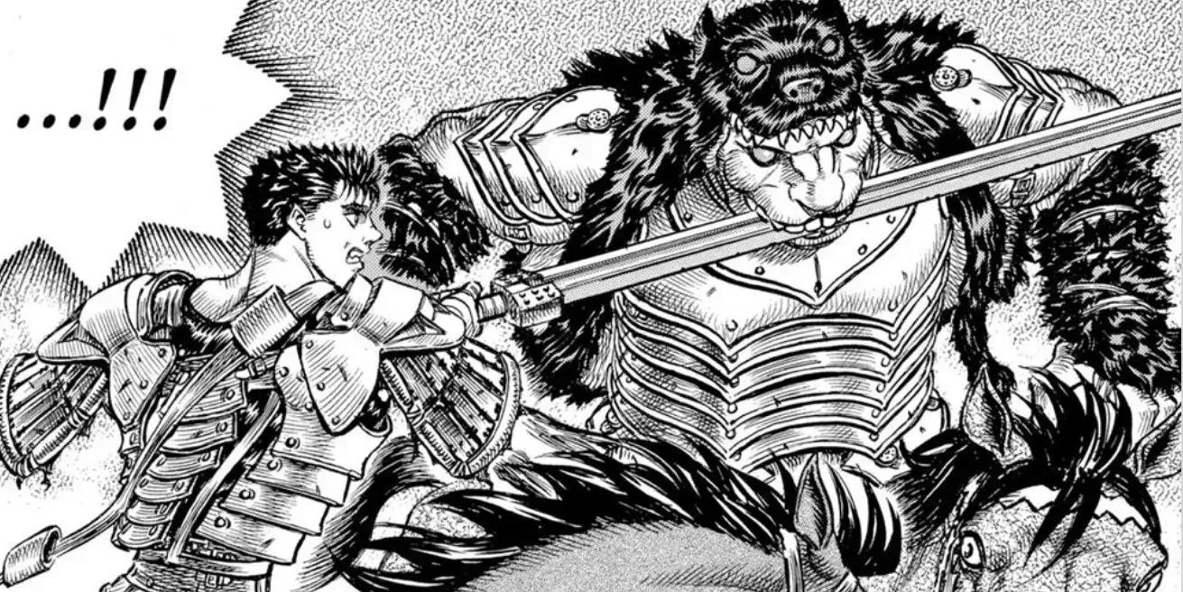 Guts es famoso por haber popularizado las espadas gigantes en el anime, blandiéndolas con pericia contra monstruos gigantes y enjambres de soldados enemigos por igual. Después de separarse de una batalla, Guts y su compañero mercenario Casca cabalgan hacia una emboscada de cien hombres, sólo para que los matones caigan uno tras otro como el trigo ante una guadaña.