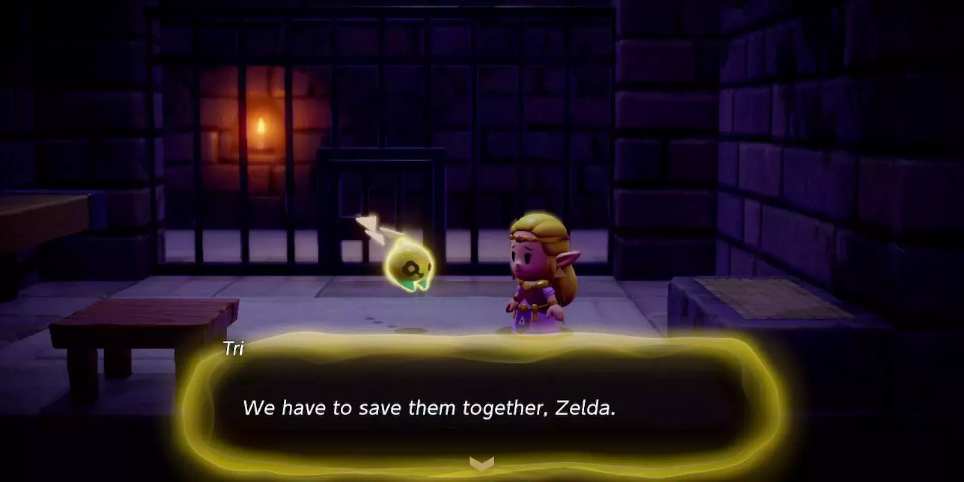 Cuando comienza EOW, Tri ha sido capturada por Ganon, y muchos de los demás miembros de su raza también han sido capturados y atrapados en las grietas. Por suerte, el poder de Tri y la sabidurÃa de la princesa Zelda resultan ser la combinación perfecta para liberar a los amigos de Tri y despejar las grietas de todo Hyrule. Tri otorga a Zelda la Vara Tri: una manifestación de su poder que la Princesa puede usar para invocar "ecos", que son copias de casi cualquier cosa con la que entre en contacto.