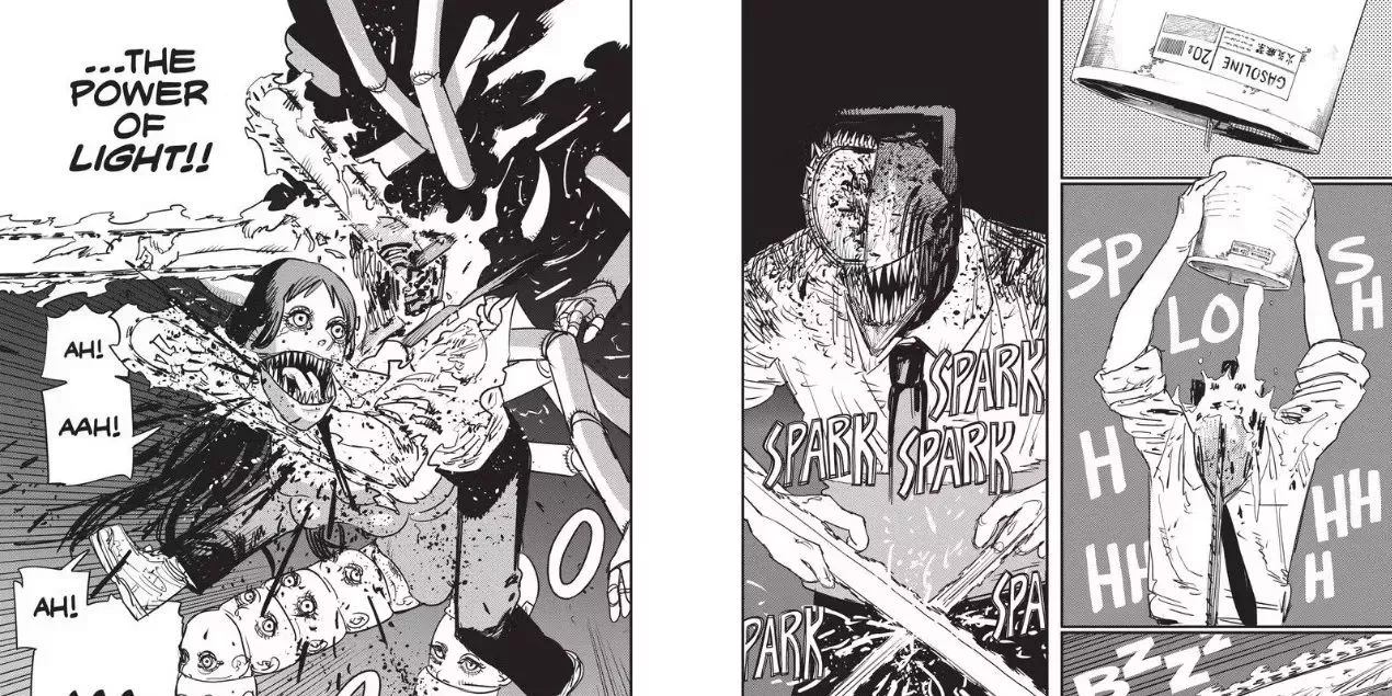 La batalla contra Santa Claus fue larga y amarga, con mucha sangre derramada de principio a fin. Las tácticas elaboradas al estilo de Shikamaru no funcionaban, asà que el protagonista Denji, siendo su yo práctico y caprichoso, se echó gasolina por todo el cuerpo y la encendió con las chispas de sus motosierras.