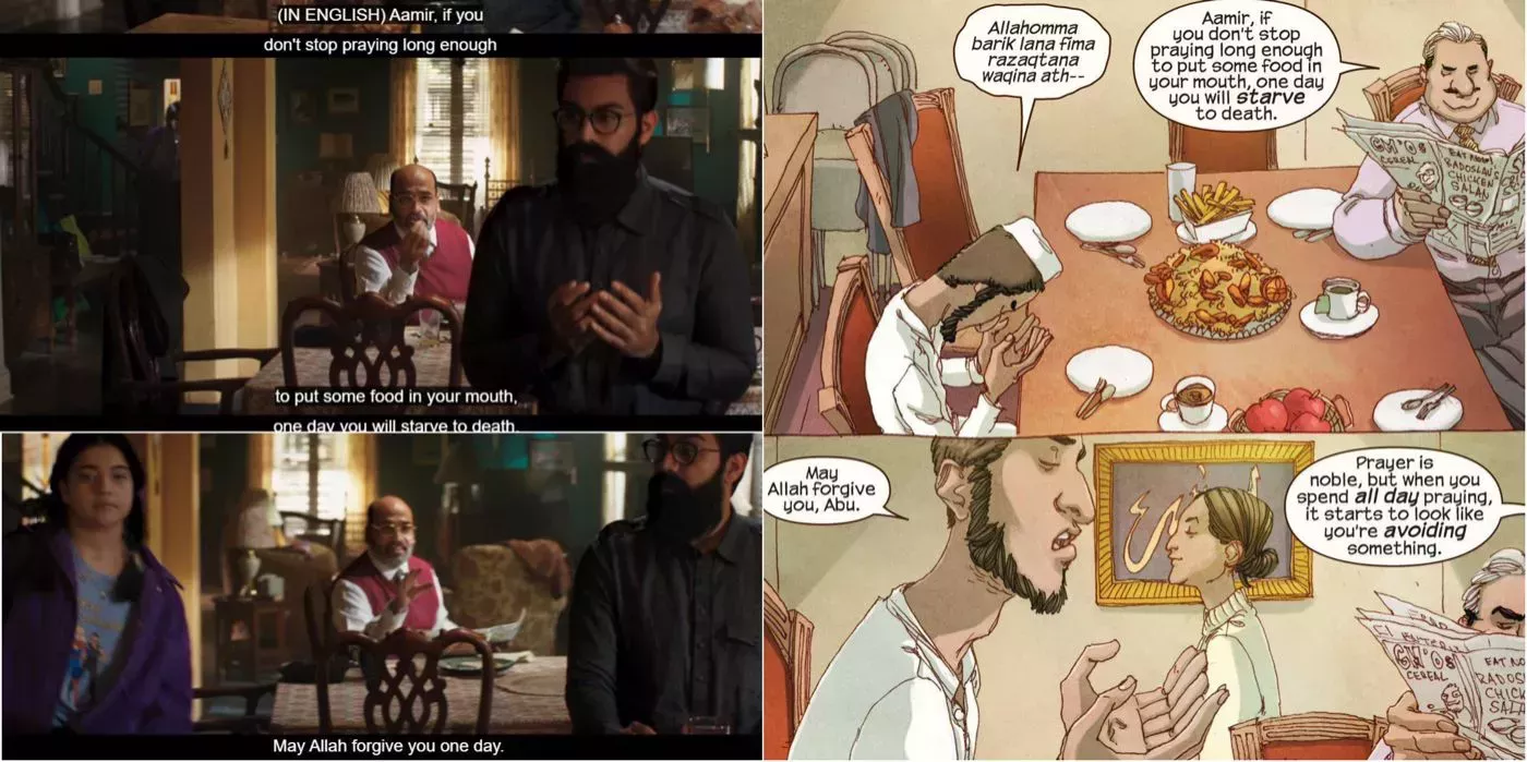 Esta escena es una adaptación prácticamente idéntica de una de las primeras conversaciones de Aamir y el Sr. Khan en los cómics. Es una prueba del compromiso de Marvel de dar a Kamala y a su familia una adaptación justa y respetuosa, arraigada en los cómics, que presta mucha atención a su herencia.
