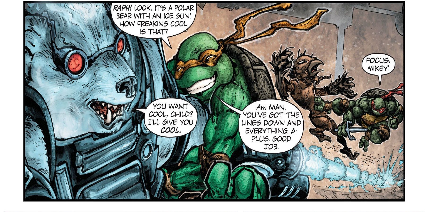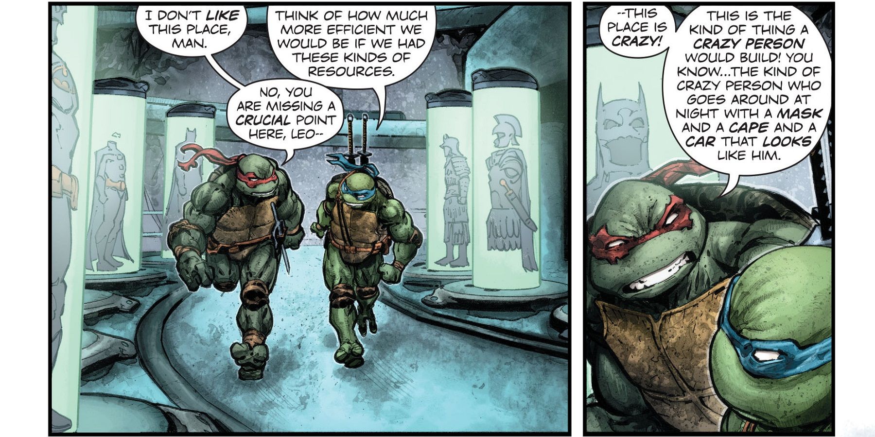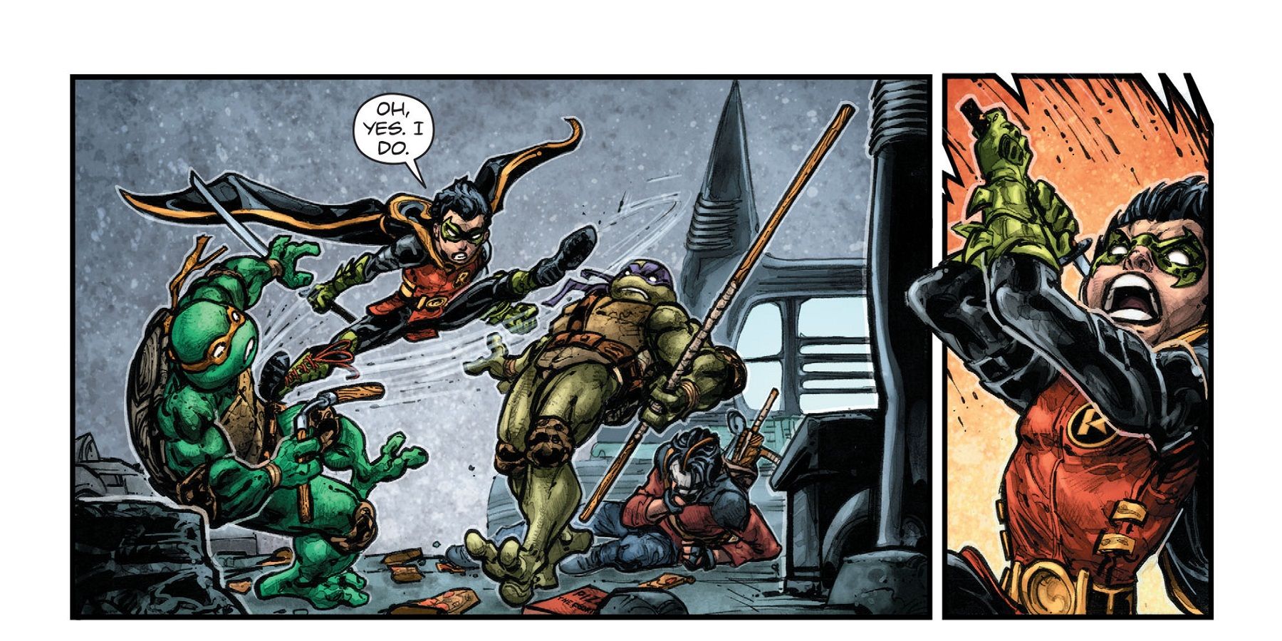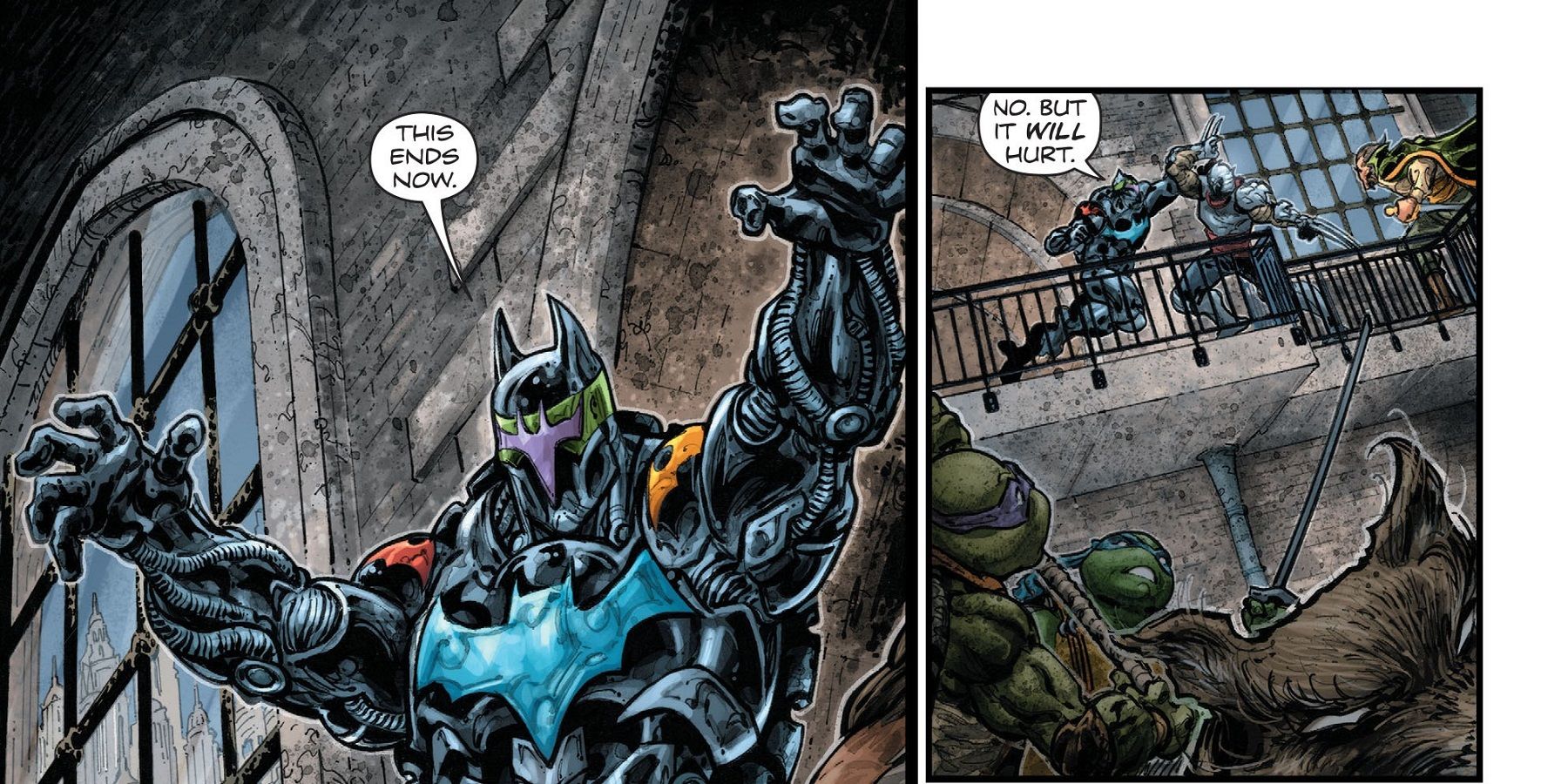 Esto no va bien, ya que Ra's y Shredder no sólo tienen sus respectivos clanes, sino también toda la galería de pícaros liberada de Arkham. Aún así, Donatello y los demás llegan con una armadura personalizada para que Batman la use en una batalla contra la Destructora, que ha sido engalanada con los colores de las Tortugas Ninja.