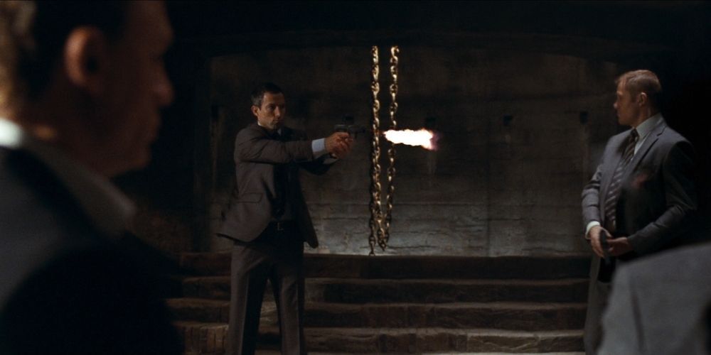 Estaba en desacuerdo con el héroe titular e incluso llegó a pronunciar la palabra "Bond" directamente a Daniel Craig. Esta escena incluía una persecución de gatos y ratones a través de los tejados y vigas de una galería de arte italiana, concluyendo con una intensa lucha en la galería mientras estaba colgado de las cuerdas. El clímax de esta confrontación se utilizó en un montaje de James Bond de 50 años en la Ceremonia de los Oscars de 2013.