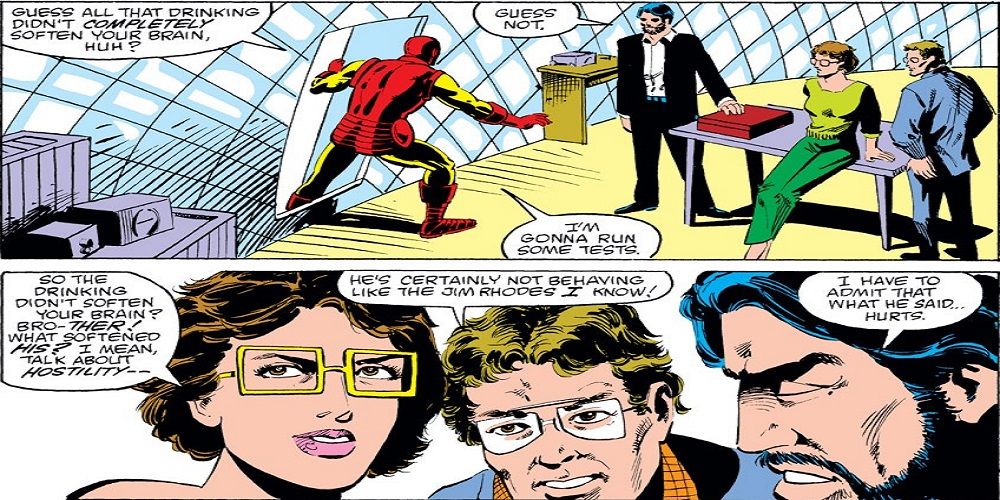 Cuando Tony Stark empezó a estar sobrio, James Rhodes no se lo tomó muy bien. En su estado de agitación, observó como Stark comenzó a usar su inteligencia para resolver problemas que no podía resolver con su propio ingenio. Al final, fue empujado al límite cuando se dio cuenta de que Stark estaba diseñando un nuevo traje, y los dos llegaron a los golpes antes de que Rhodey se diera cuenta de lo que estaba haciendo.