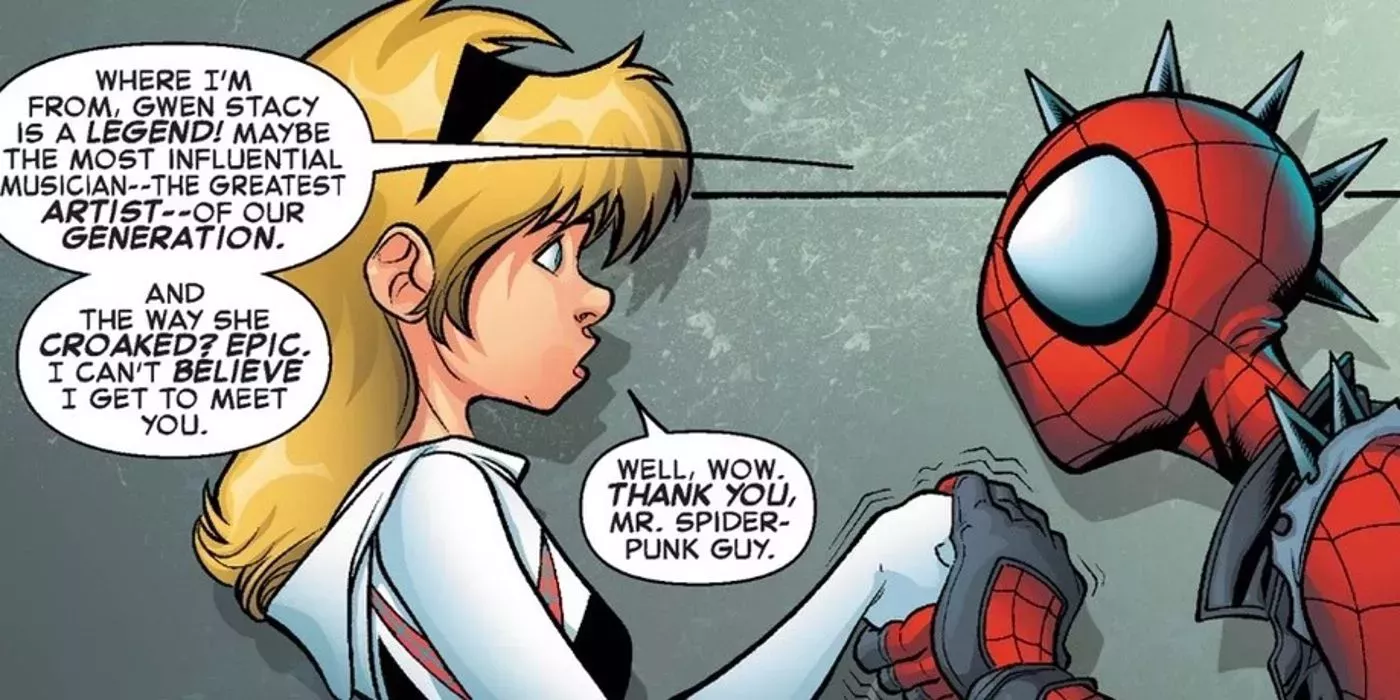 Aunque los fans conocen la larga relación entre Peter Parker y Gwen Stacy, pocos saben cuánto admiraba Spider-Punk a la versión de Gwen Stacy de Tierra-138, a la que considera una "leyenda" por sus contribuciones musicales.