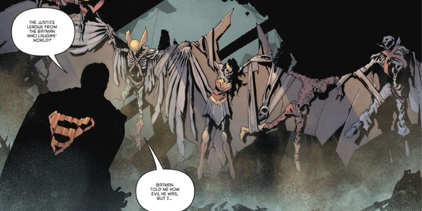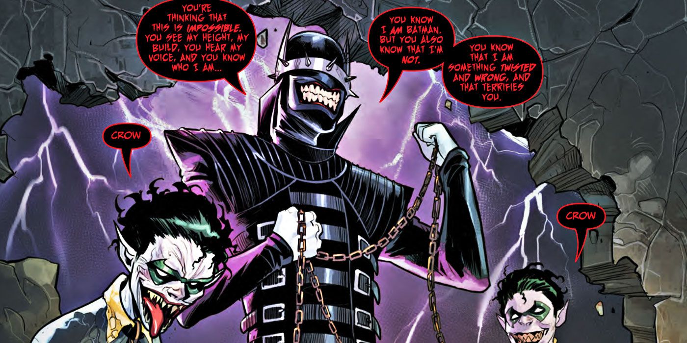 El Batman que rÃe es un nombre apropiado para la versión del Multiverso Oscuro del Cruzado de la Capa. Corrompido por su guerra contra el crimen, El Batman que rÃe no deja una sonrisa en la cara de sus enemigos, especialmente cuando les inflige un gran dolor.